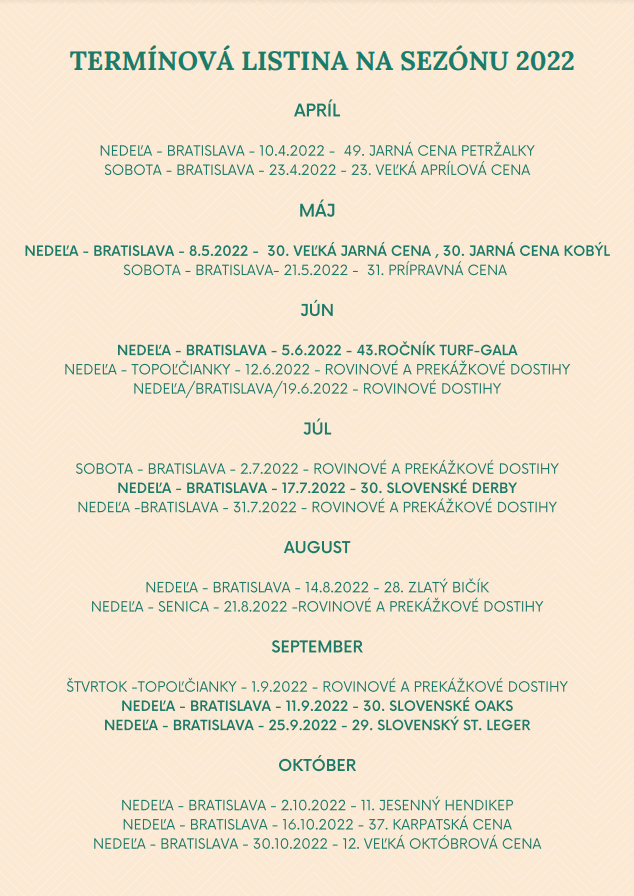 Dostihová sezóna bude opäť bohatá na podujatia ako každý rok a milovníci rovinových dostihov, klusákov v sulkách či steeplechase si opäť prídu na svoje. Prvé tohtoročné dostihy sa odštartujú 10. apríla tradičným podujatím Jarná cena Petržalky. Počas celého obdobia sa diváci môžu tešiť až na 18 dostihov, z toho dva dostihové dni sa budú konať v Topoľčiankach a jeden v Senici. Ako už tradične nebudú chýbať veľkolepé podujatie ako slávnostný Turf Gala či Slovenské derby. Posledné preteky sa pobežia v nedeľu 30. októbra.